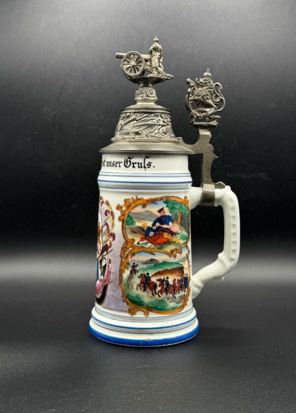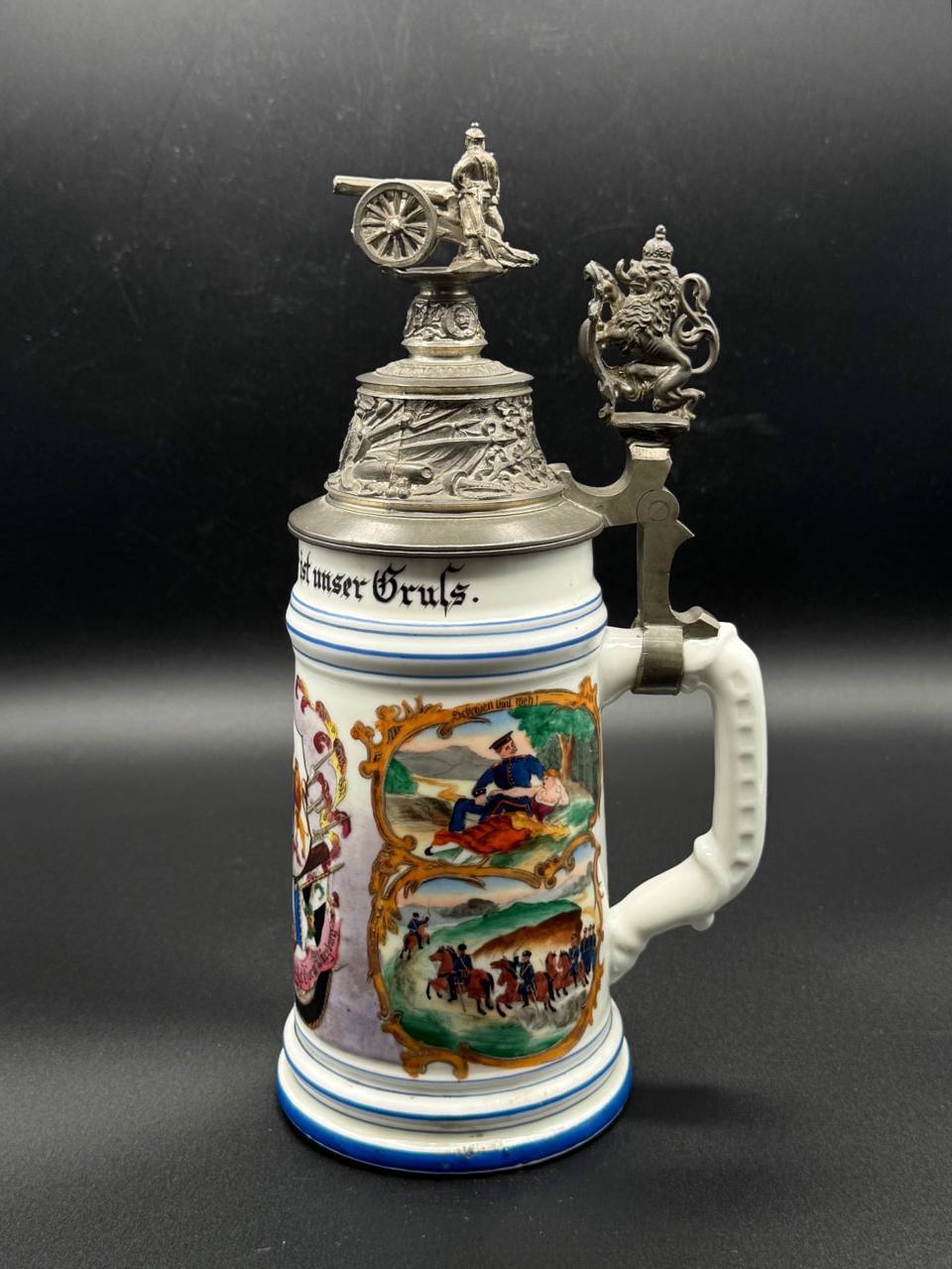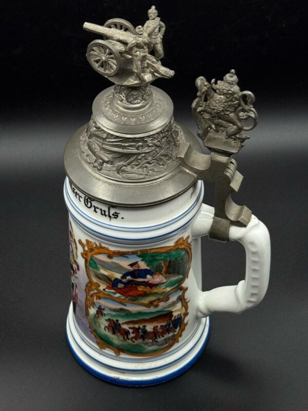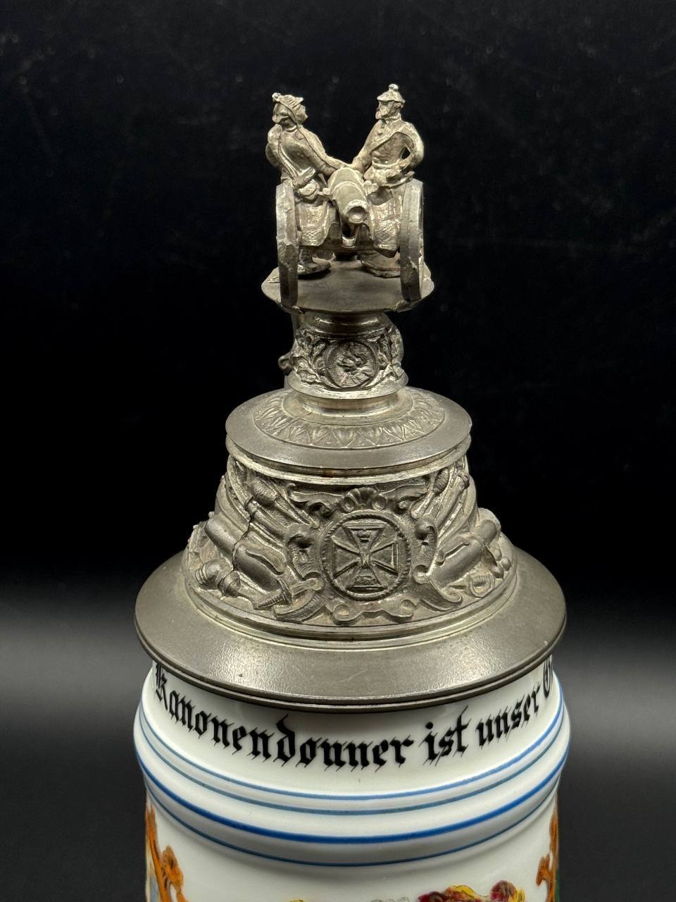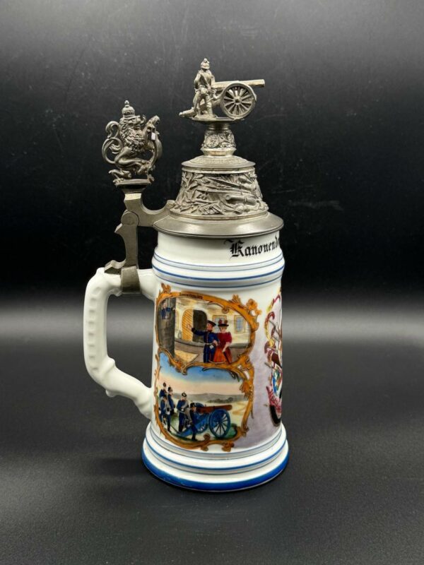 Pewter lid richly embossed with military motifs and topped by a three-dimensional cannon and gun crew, with a Bavarian lion thumb lift. Interior base contains a lithophane showing an artilleryman at his gun.