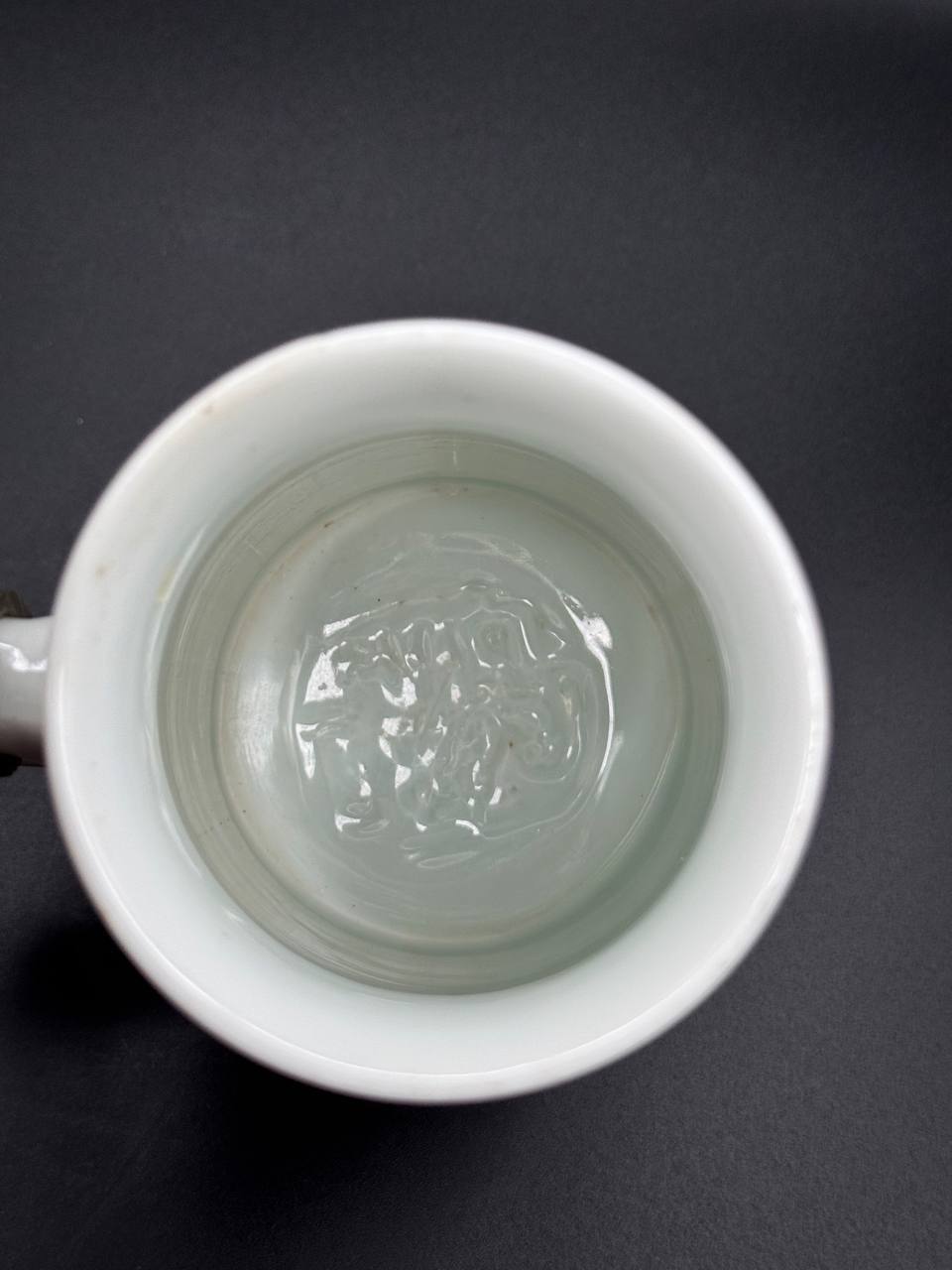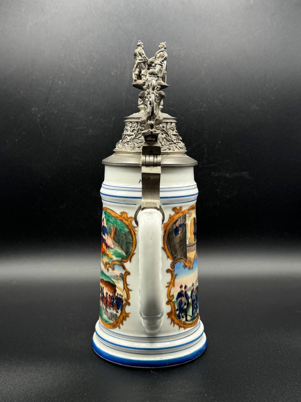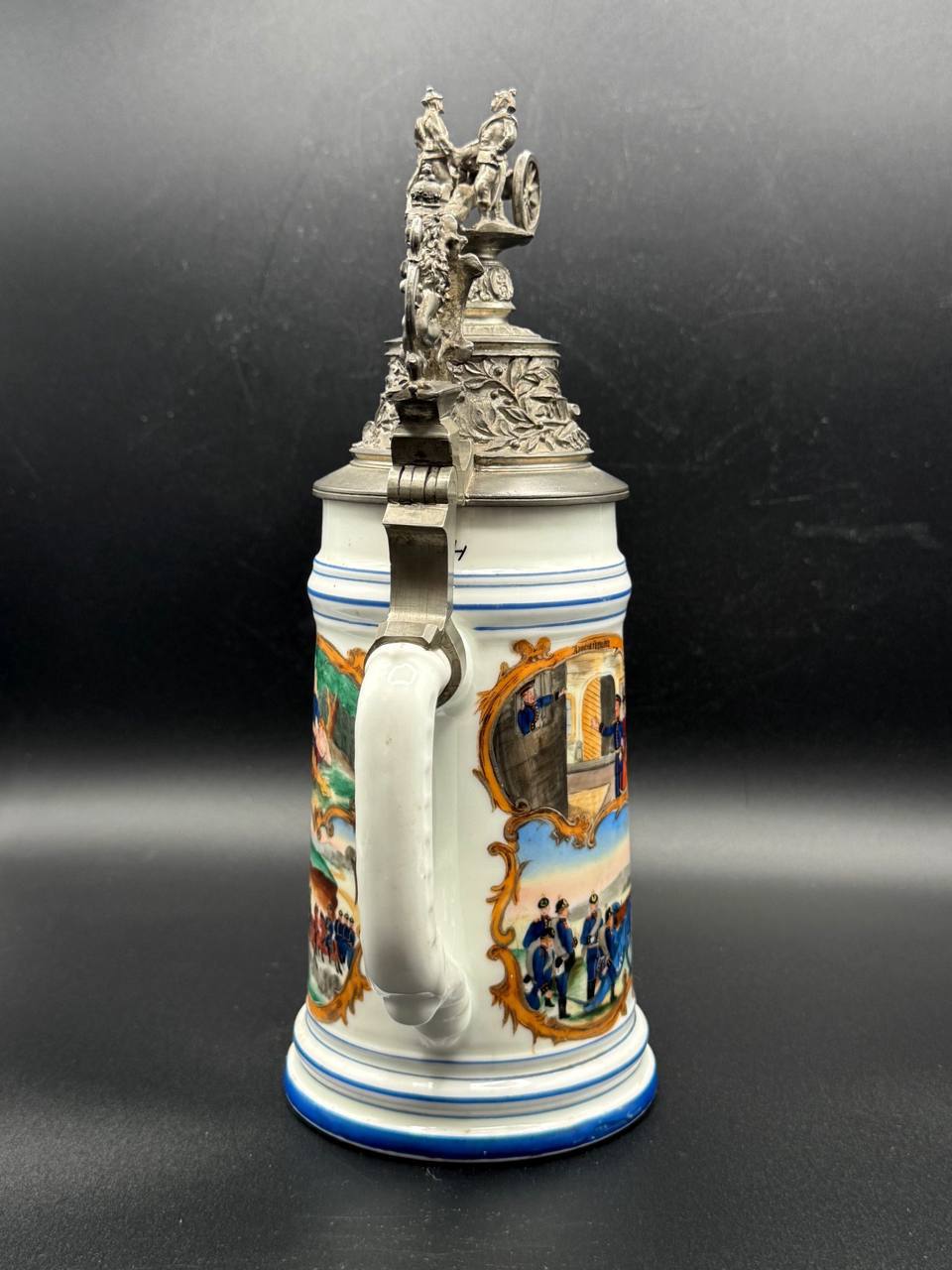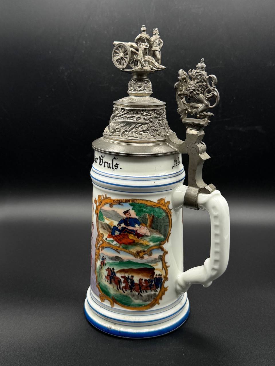 Pewter lid richly embossed with military motifs and topped by a three-dimensional cannon and gun crew, with a Bavarian lion thumb lift. Interior base contains a lithophane showing an artilleryman at his gun.