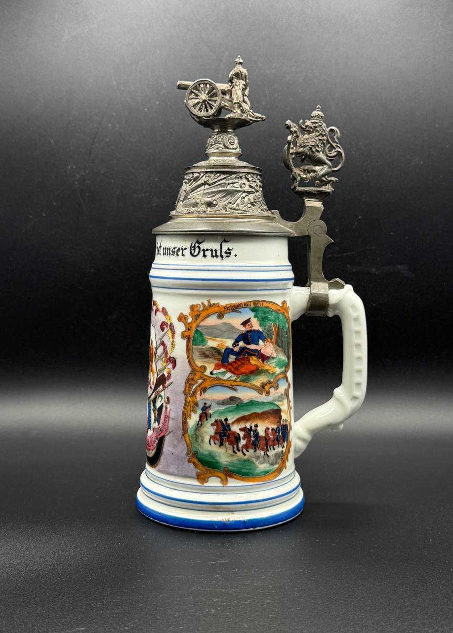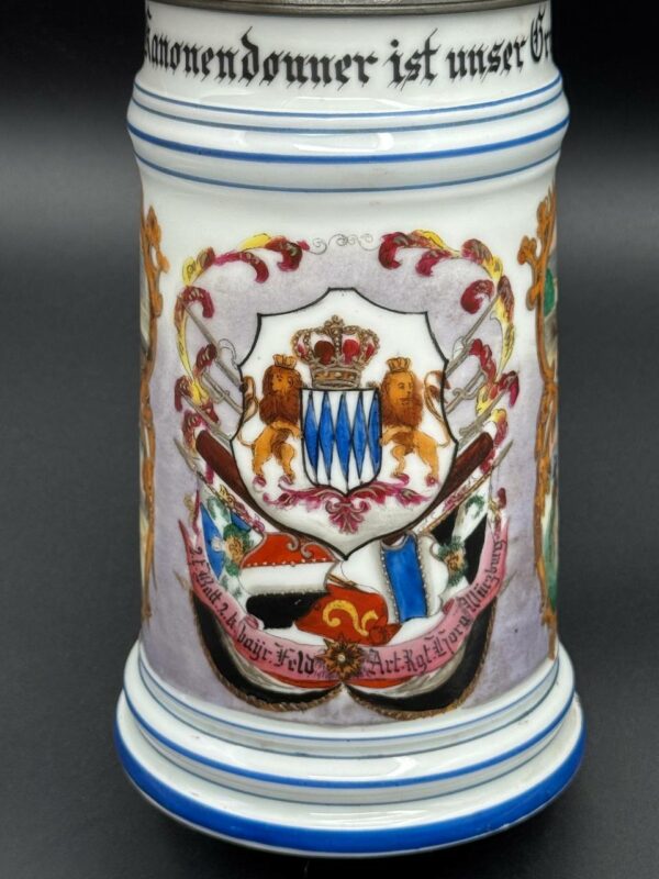 A fine porcelain regimental stein dedicated to the 2nd Bavarian Field Artillery Regiment “Prince Luitpold,” stationed in Augsburg, around 1900.