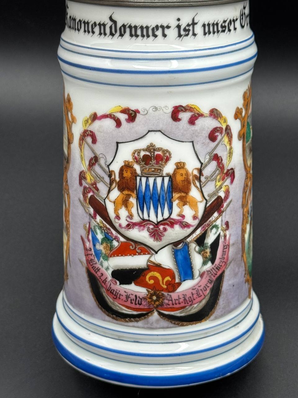 Hand-painted body featuring the Bavarian coat of arms flanked by two lions and the regimental title beneath. Side panels depict vivid service scenes — artillery training, field maneuvers, farewells, and moments of rest.