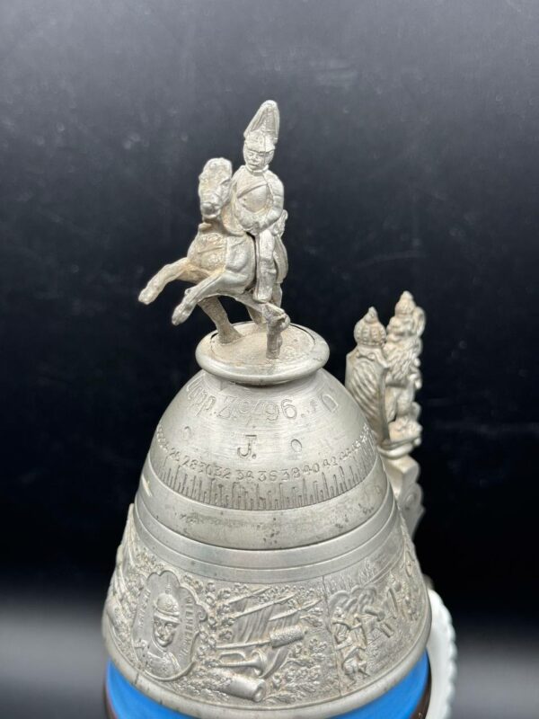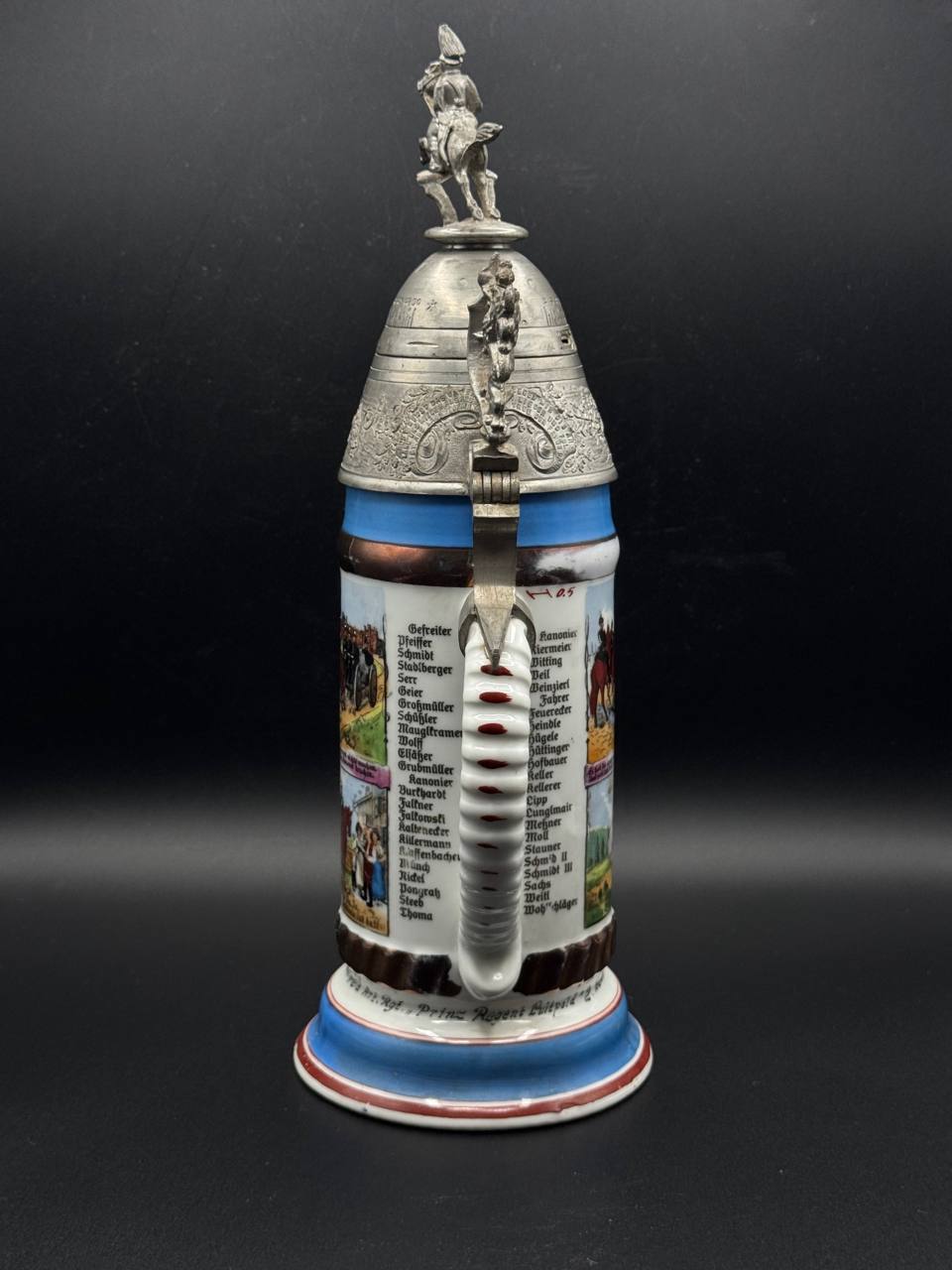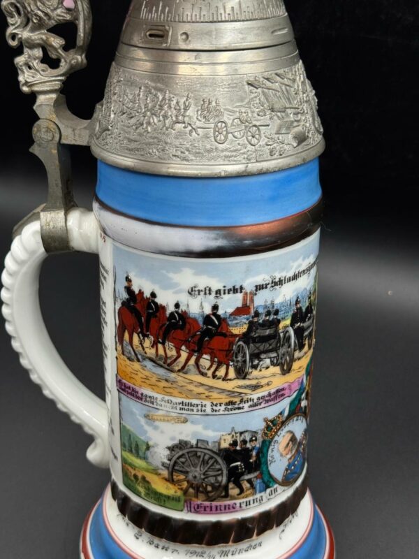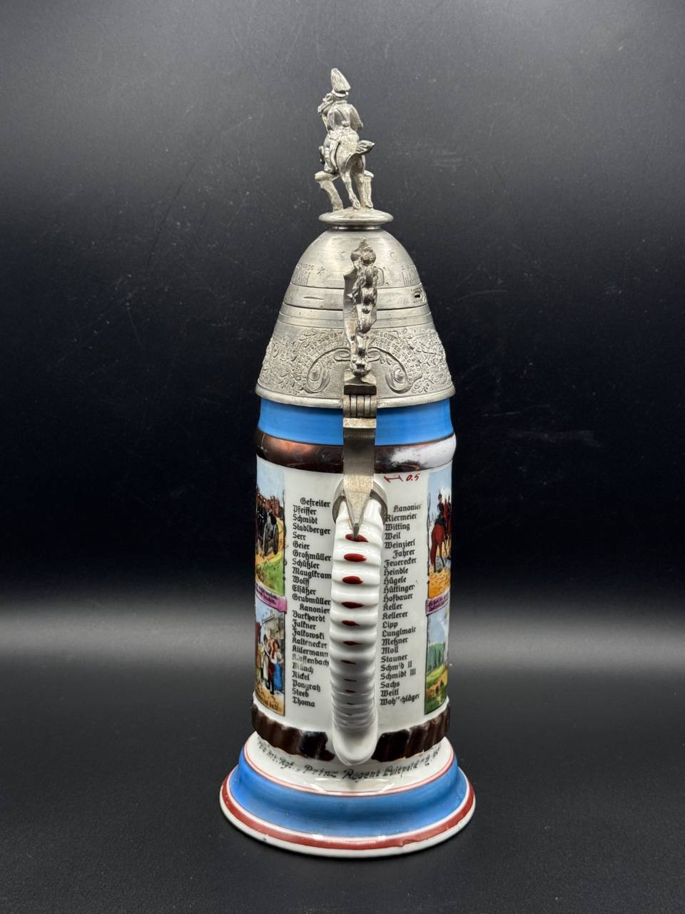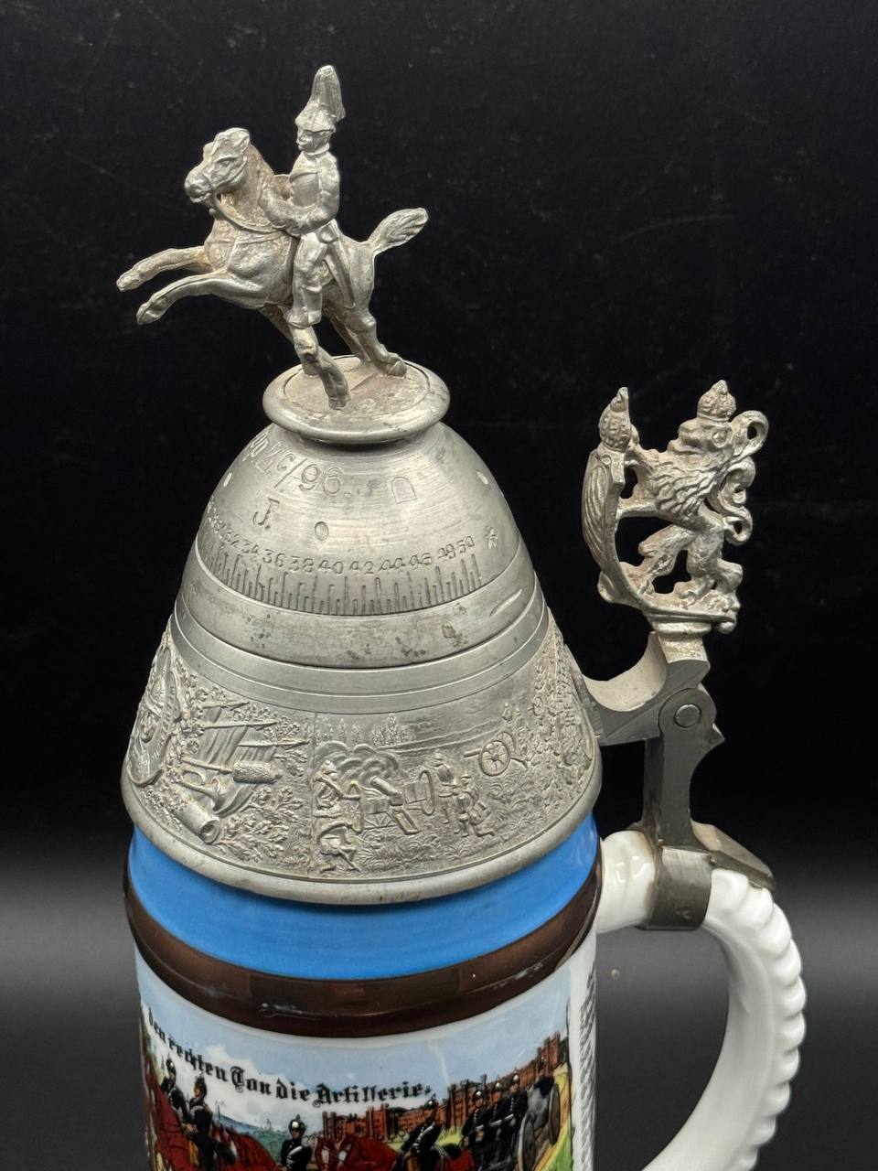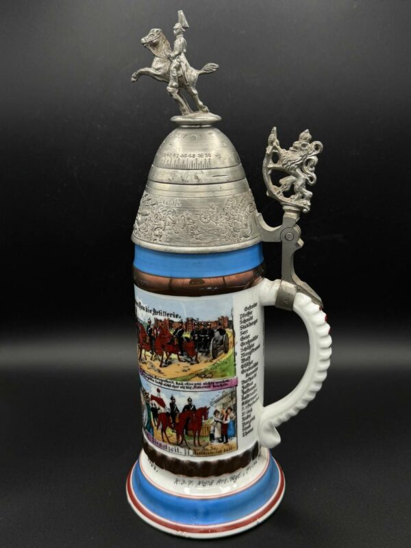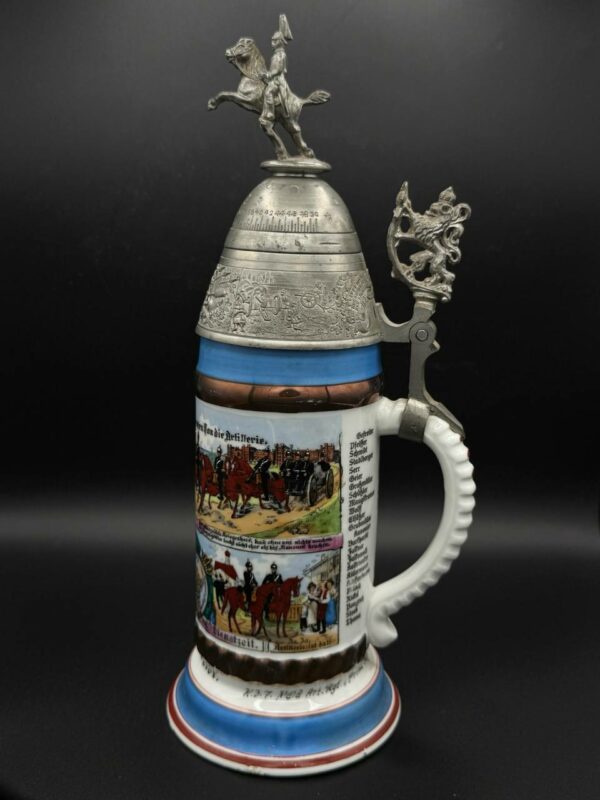 Handle lists comrades-in-arms from the same battery. Pewter lid topped with a mounted cavalryman, richly engraved with battle motifs; thumb lift shaped as the Bavarian lion. Interior lithophane shows a soldier with cannon.