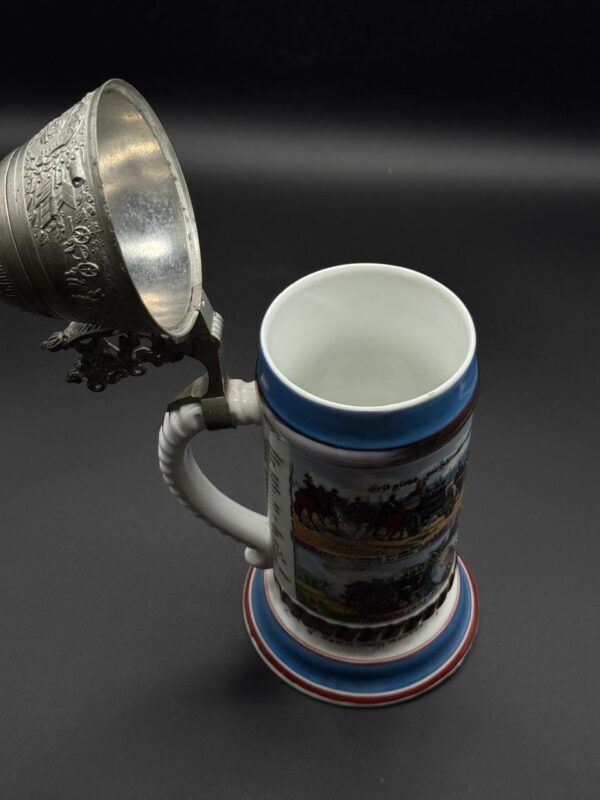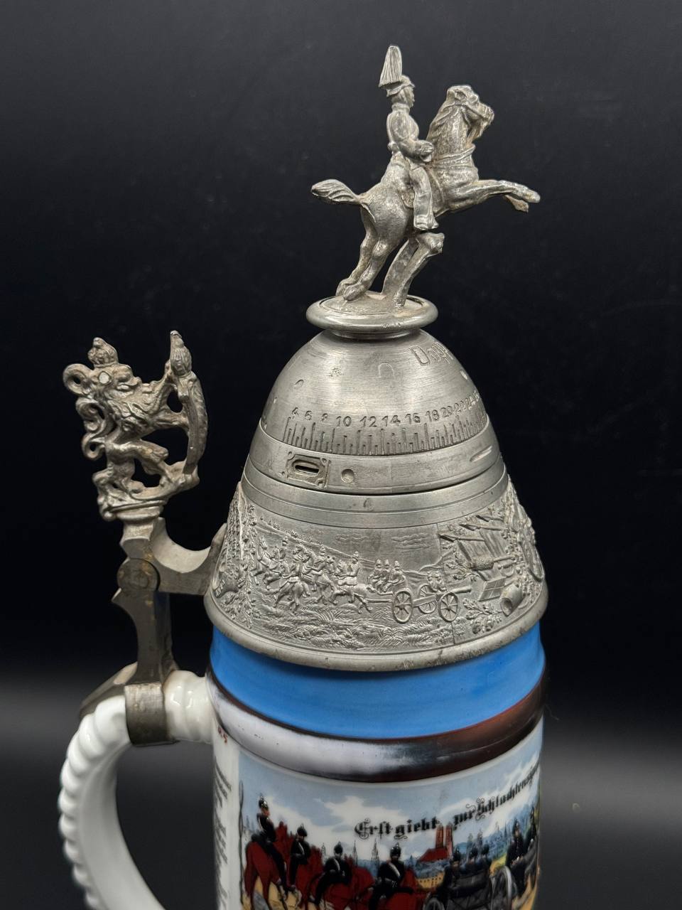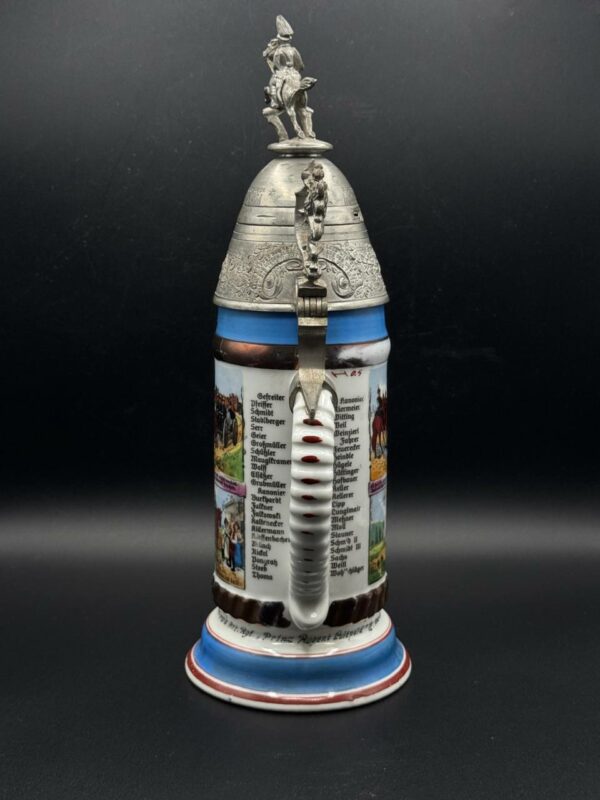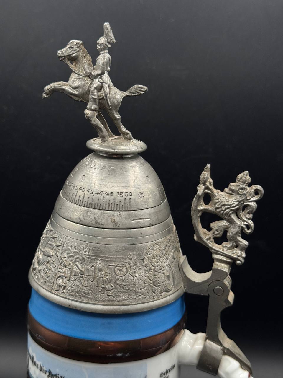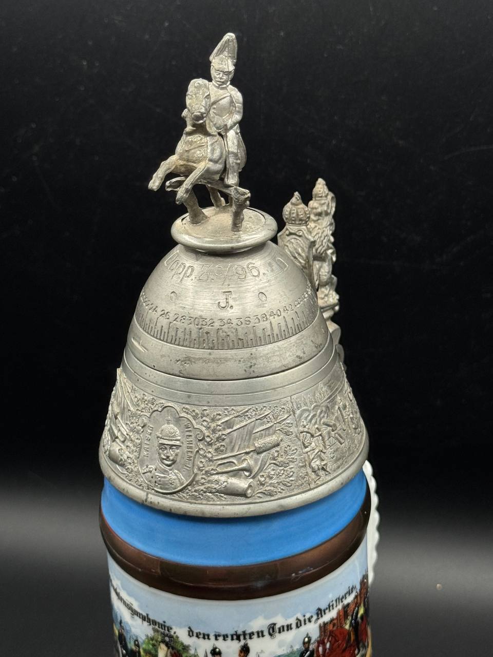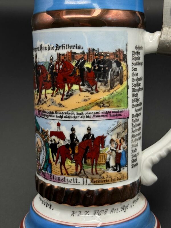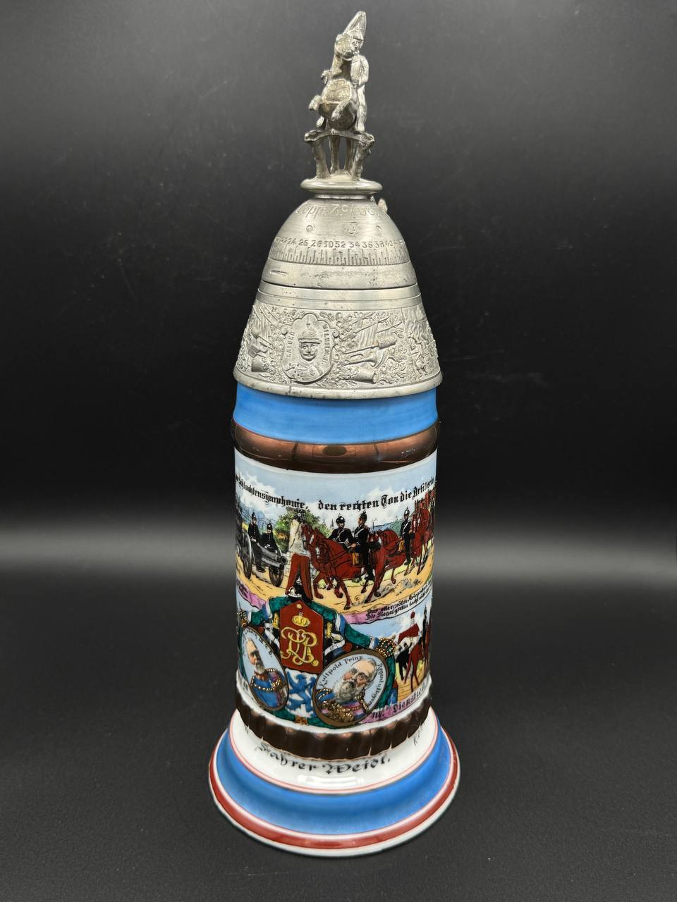 Handle lists comrades-in-arms from the same battery. Pewter lid topped with a mounted cavalryman, richly engraved with battle motifs; thumb lift shaped as the Bavarian lion. Interior lithophane shows a soldier with cannon.