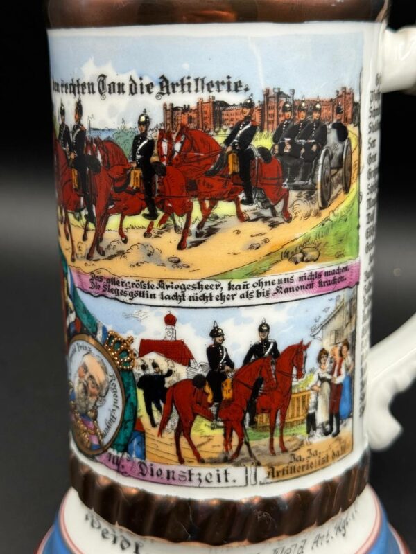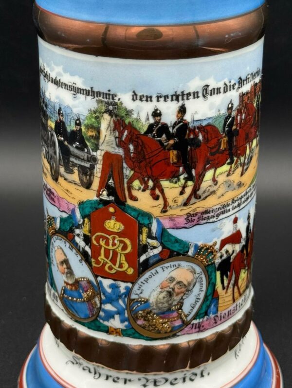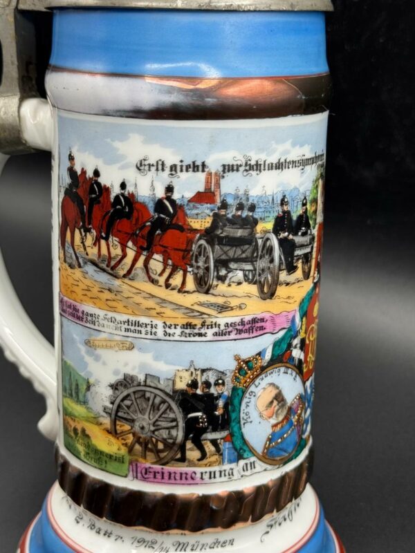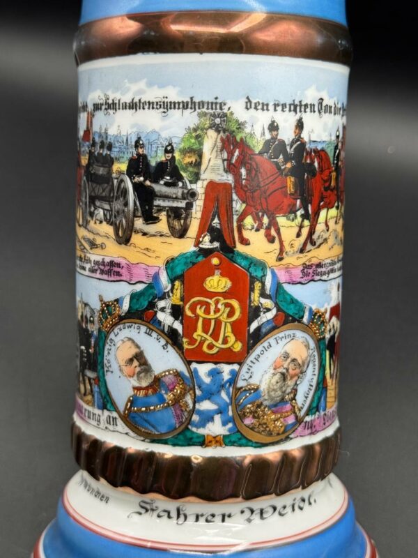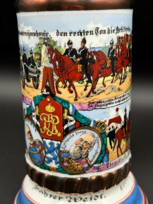 finely painted regimental stein commemorating the service of Driver Weidl with the 3rd Bavarian Field Artillery Regiment “Prince Regent Luitpold of Bavaria,” stationed in Munich, 1903–1905.