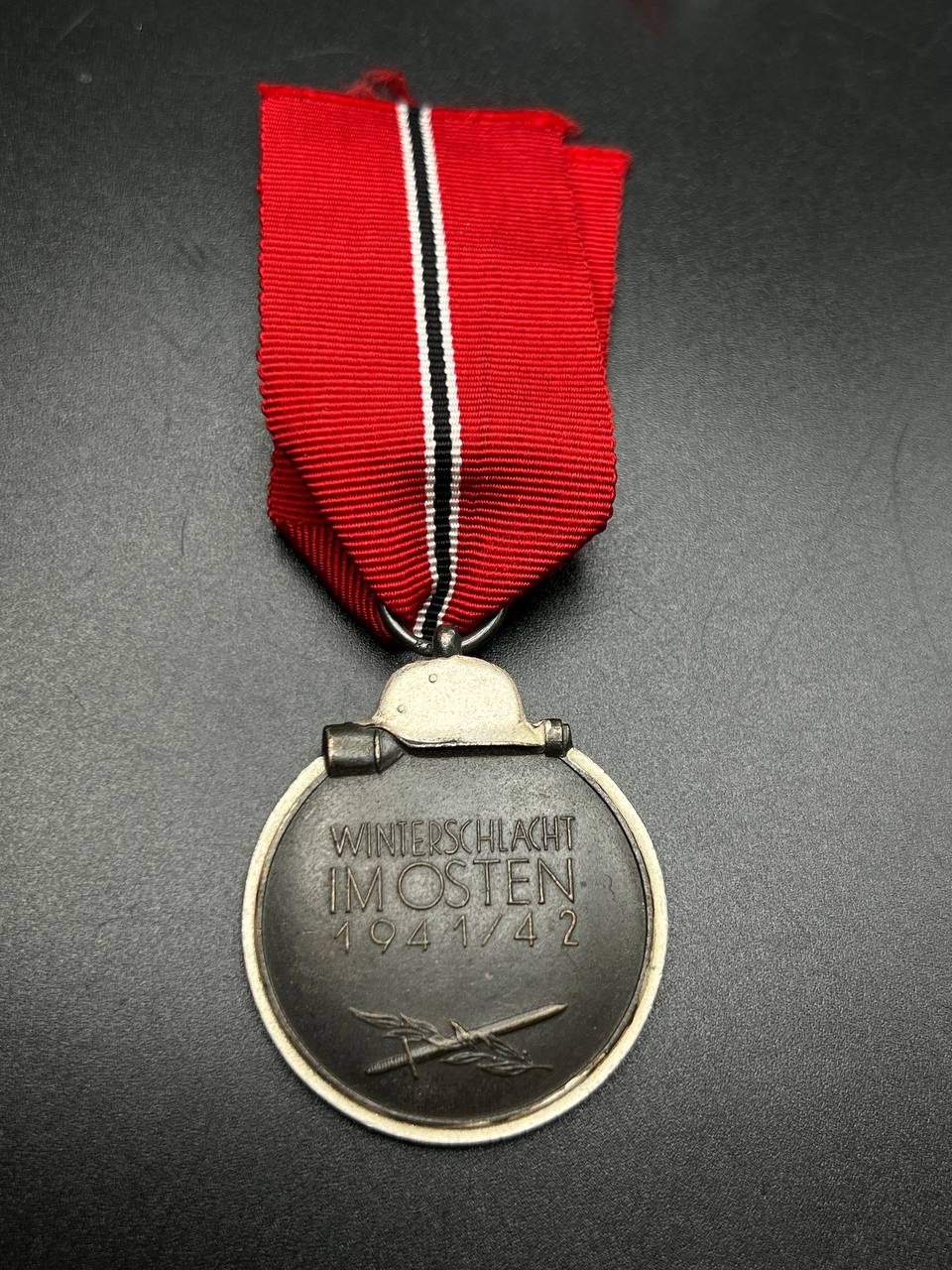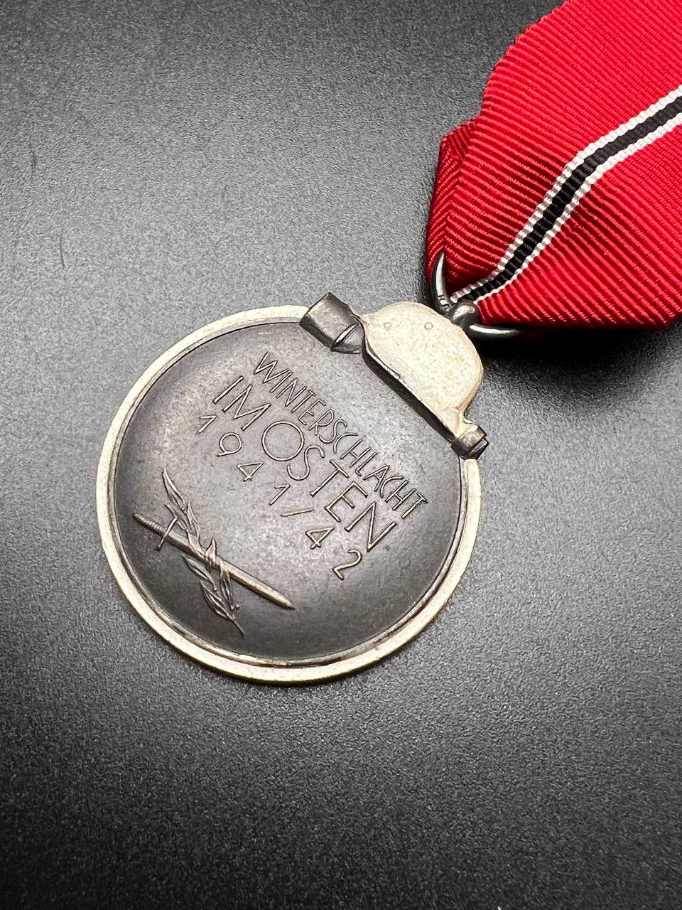 Original Eastern Front Medal “Ostmedaille” 1941/42, early suspension ring stamped with clear maker’s code “88”. Medal shows attractive patina and comes with its correct period red-white ribbon. Reverse features the inscription WINTERSCHLACHT IM OSTEN 1941/42 with crossed sword and branch. Sharp details on the eagle and helmet, with light, honest wear.