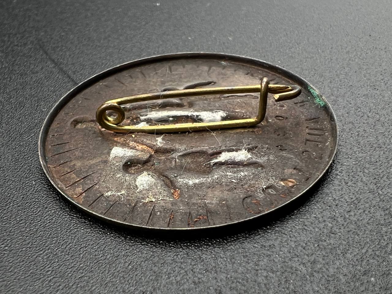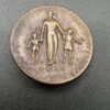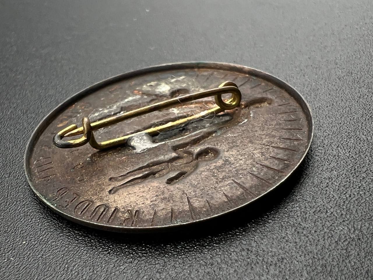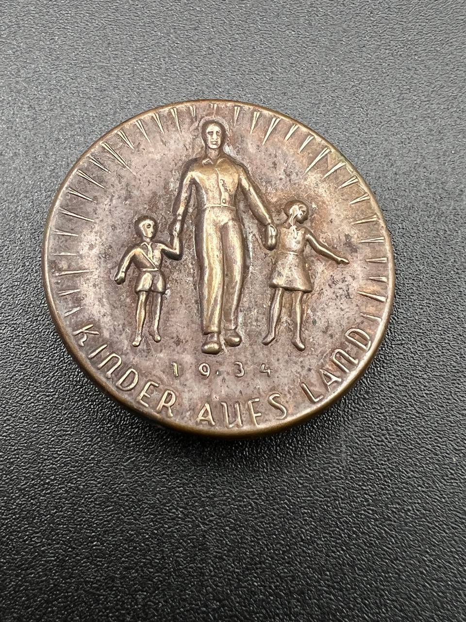 Original German charity badge from 1934 issued for the “Kinder aufs Land” (“Children to the Countryside”) program, organized under the NSDAP and the Winter Relief (WHW) initiative. Bronze-finished metal construction with pin-back fastening. Obverse depicts an adult leading two children surrounded by sun rays, dated 1934 with inscription “Kinder aufs Land”. Early WHW-related social campaign badge. Good condition with attractive bronze patina.
