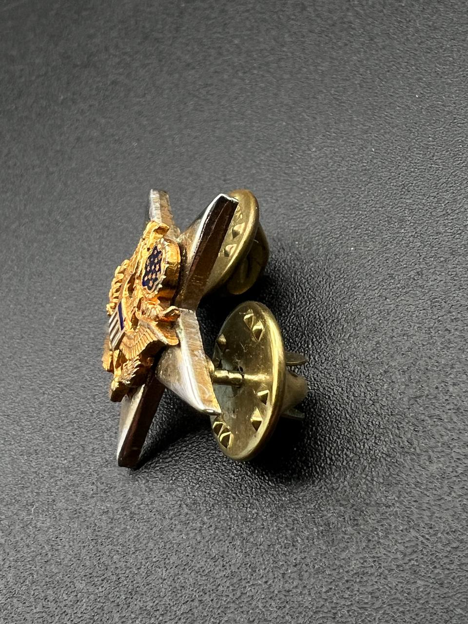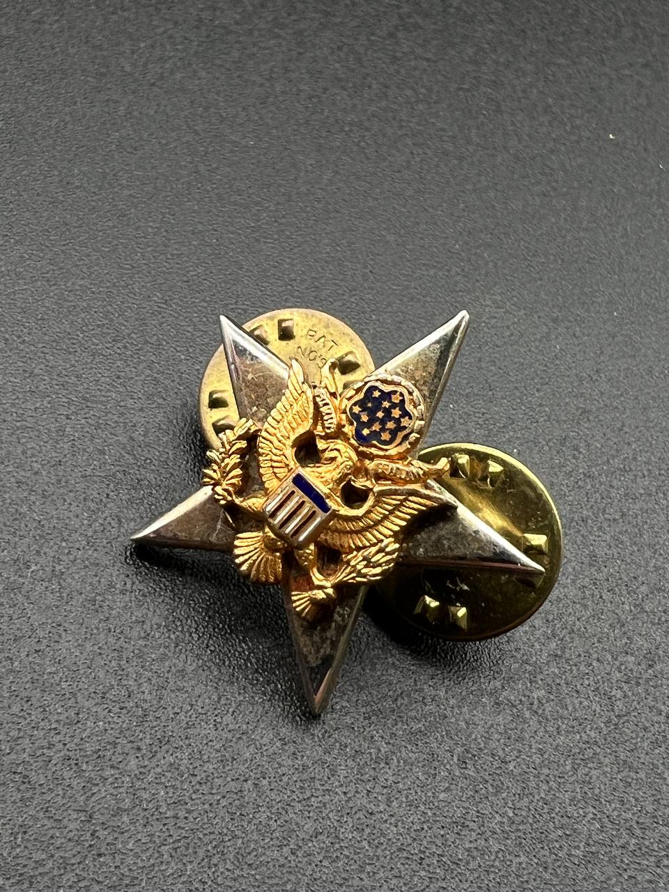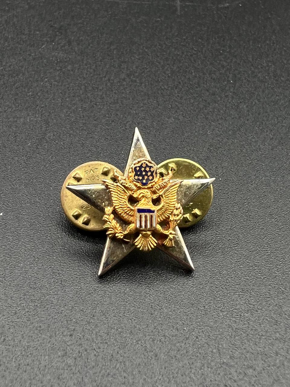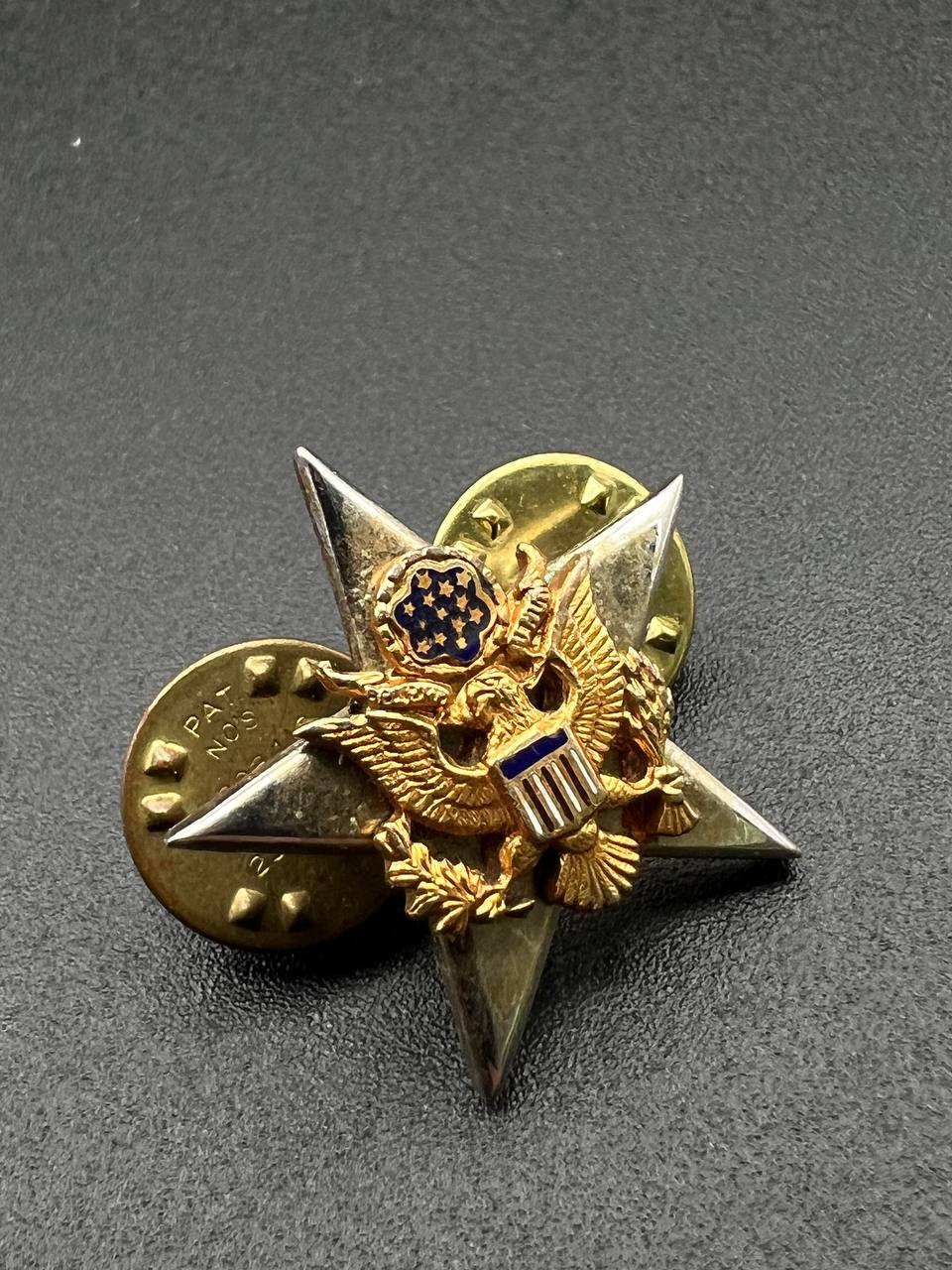 Emblem in the form of a silver five-pointed star with a gold-colored Great Seal of the United States — an eagle holding a shield, olive branch, and arrows. Worn on the collar or cap by U.S. Army officers and enlisted personnel during and after World War II (1940s–1950s).