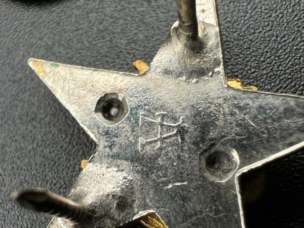 The reverse side bears the manufacturer’s hallmark. Attachment by two pin posts with brass clutch-back fasteners.