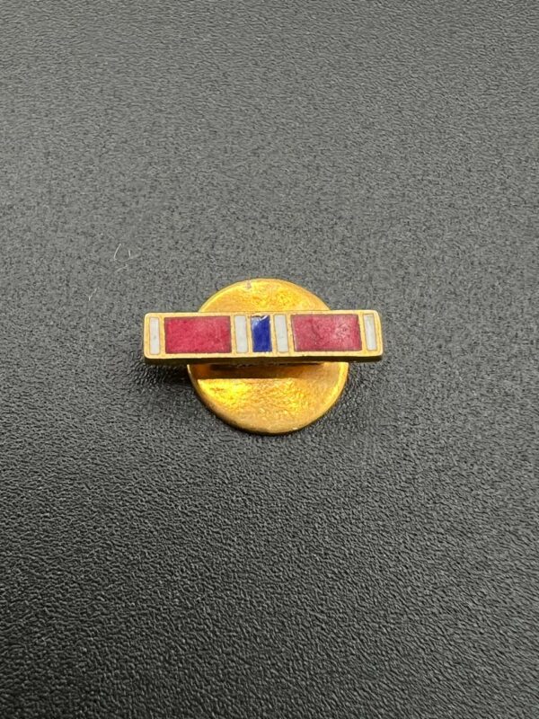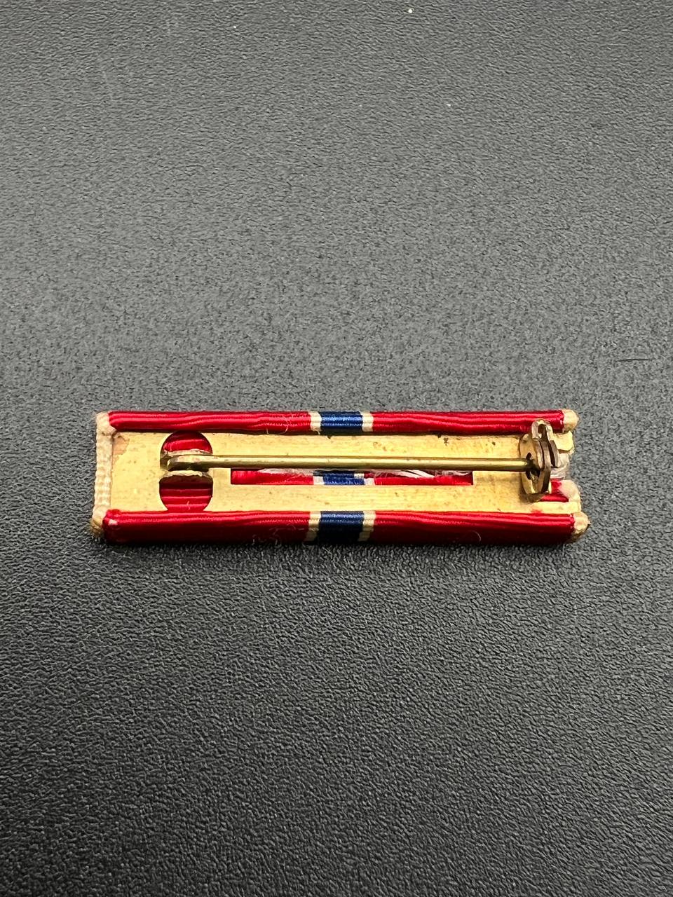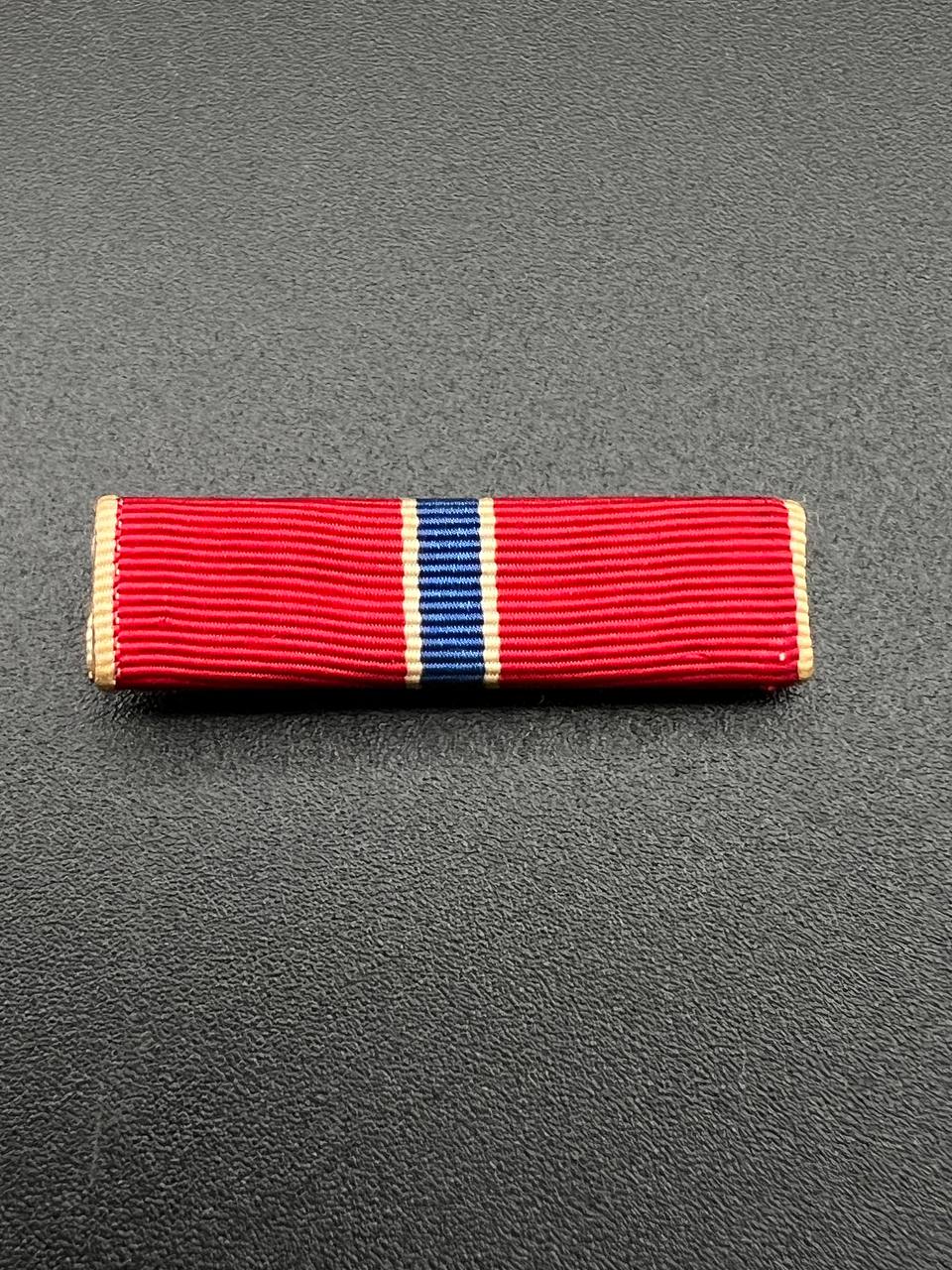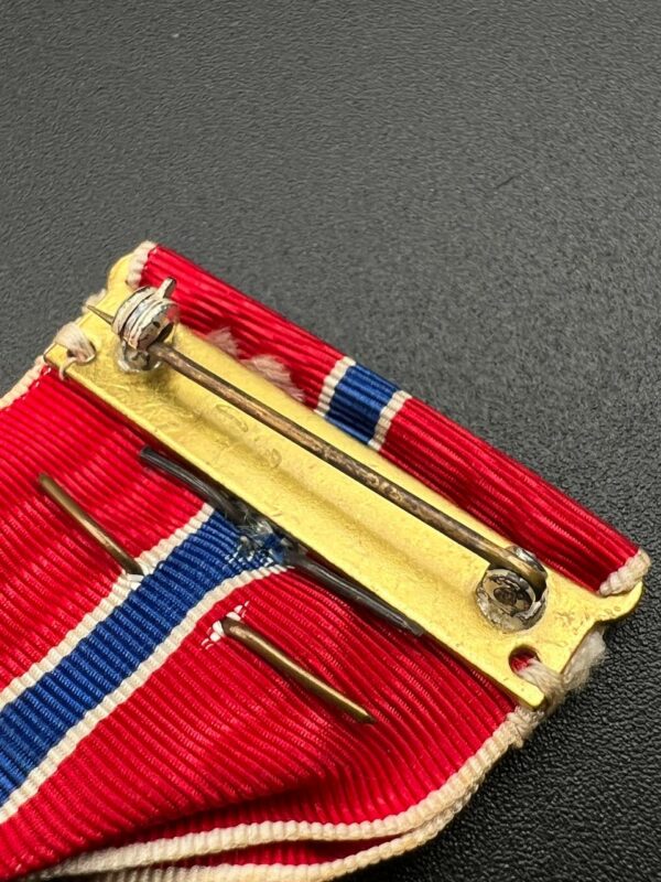 The reverse of the medal reads “Heroic or Meritorious Achievement.” The ribbon is red with blue and white edges — the standard pattern for this decoration.